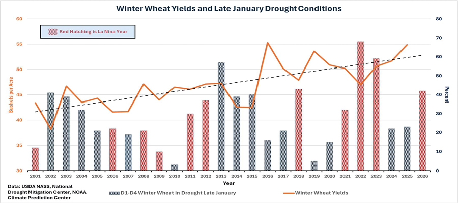 The chart shows national winter wheat yields from 2001 to 2025 with the drought levels for the crop on Jan. 20. The red hatching indicates a La Niña event occurred during the winter of that crop year. Final yields do not always fall below trend under drought conditions at or above the present levels in January. The addition of La Niña conditions can affect yields, but the outcome is far from assured.
