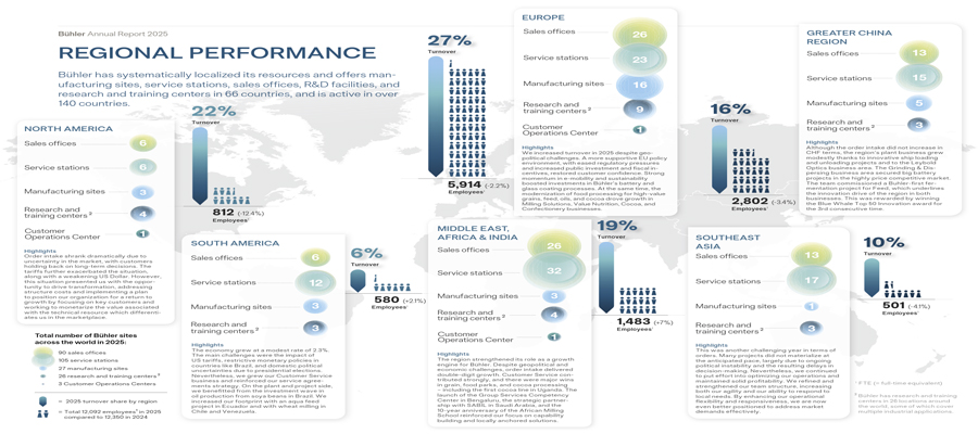 Bühler’s global setup and network remained balanced, with some regional shifts. US order intake declined by 31% amid tariff-related uncertainty and customers deferring investments in plants and solutions. The strongest growth in turnover originated from Africa, which for the first time became the largest region for Bühler’s food and feed businesses. The continued strength of the Middle East, Africa & India region – with particularly high growth in Africa and the Middle East – in part offsets slower performance in the Americas and Asia.