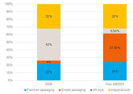 Traditionally, the majority of domestic oil for food consumption has been sold in bulk, either to food producers or to retail markets, allowing households to purchase unbranded oil in small, affordable amounts. Since 2014, however, the government has had a policy that all bulk oil intended for households should be packaged. Multiple regulations were issued to regulate packaging and other distribution and trade issues. There was limited success, however, in changing packaging, due in part to opposition from middlemen and retailers. In 2022, the government launched the “People’s Cooking Oil Programme,” which aims to provide fair and equal access to affordable cooking oil for the public. The programme includes requiring oil refineries to fulfil domestic market obligations before they can get export quotas, establishing a maximum retail price, and requiring oil to be packaged in “simple packaging” under the Minyakita brand. The programme appears to have been successful in increasing the proportion of household cooking oil that is packaged. BPOM reports that there are 157 registered producers and packagers of Minyakita in 16 provinces and 485 registered Minyakita brands for the years 2022 and 2023. As shown in Figure 2, bulk household oil has fallen from 42% to 6.5%; the proportion of oil in “simple packaging” has increased correspondingly from 4% to 37.5%.