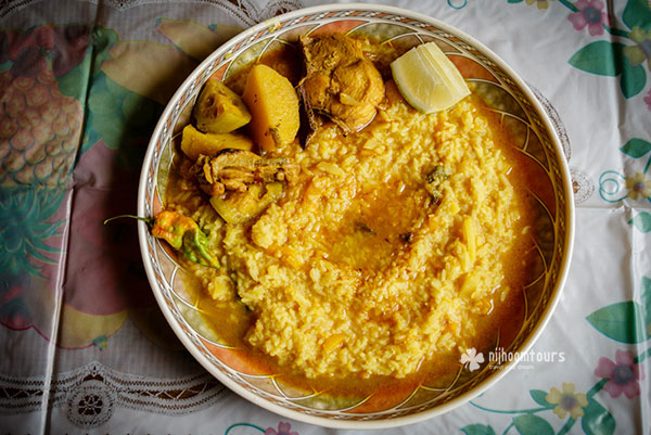 Patla Khichuri is a romantic food in Bangladesh. During the heavy rain of a monsoon day, a hot plate of Patla Khichuri with meat is what any traditional Bengali people want! Patla Khichuri is cooked in every village house during the two Eid festivals, the biggest festivals in Bangladesh. When people go to visit other people’s houses in any village during Eid, Patla Khichuri is a common thing to serve with meat curry, along with the special Eid dessert called Semai.