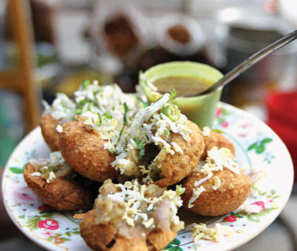 Fuchka is the most popular street food in Bangladesh, served mainly in the evening. It has a unique spicy, sour, crispy taste. It consists of a round, hollow puri, fried crisp, and filled with a mixture of flavored water, tamarind chutney, chili, chaat masala, potato, onion, and chickpeas. Fuchka uses a mixture of boiled mashed potatoes as the filling and is tangy rather than sweetish, while the water is sour and spicy.