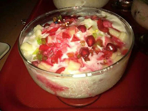 Falooda is a cold dessert very popular in Bangladesh. Traditionally, it is made from mixing rose syrup, vermicelli, sweet basil (sabza/takmaria) seeds, and pieces of jelly with milk, often topped off with a scoop of ice cream, and lastly garnished with chopped fruits. The vermicelli used for preparing Falooda is made from wheat, arrowroot, cornstarch, or sago pearls.